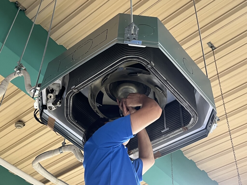 エアコンのカバー・吹き出し口の取り外し・内部アルミフィン(熱交換部分)を専用洗剤と高圧洗浄機で洗浄します。